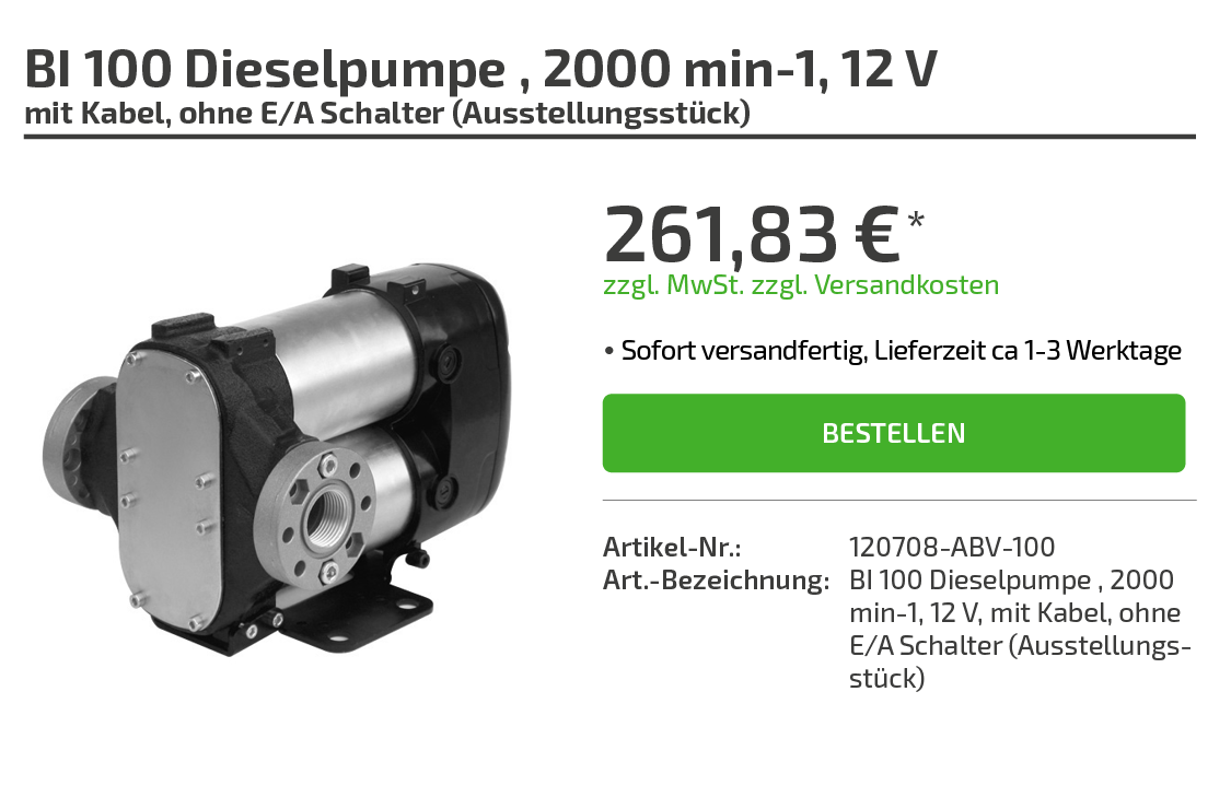 BI 100 Dieselpumpe , 2000 min-1, 12 V, mit Kabel, ohne E/A Schalter (Ausstellungsstück)