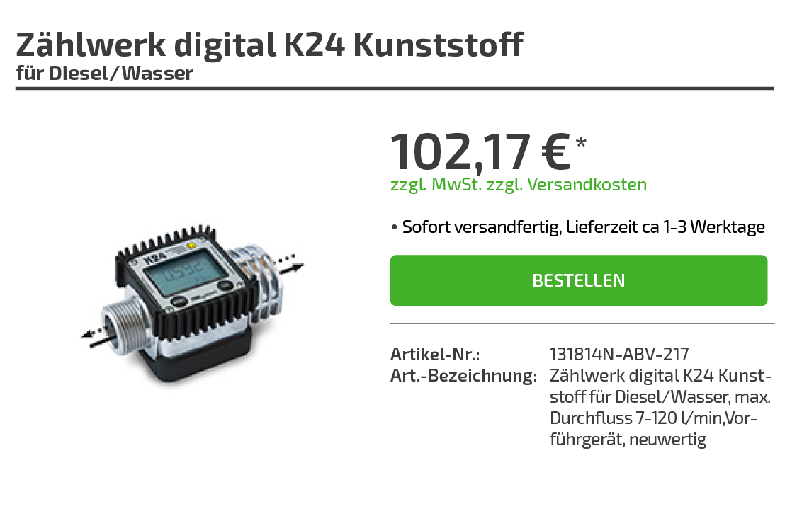 TZählwerk digital K24 Kunststoff für Diesel/Wasser,max. Durchfluss 7-120 l/min, Vorführgerät, neuwertig